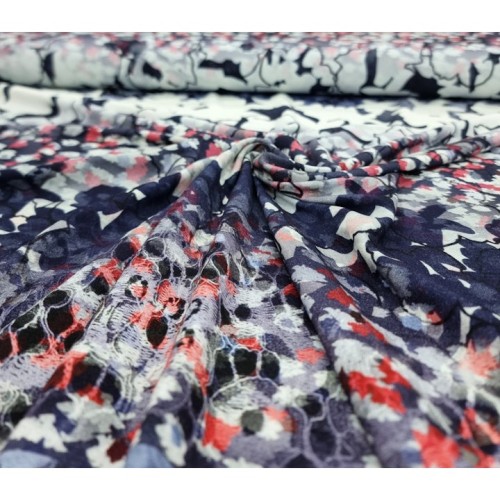 Viscose tricot paneel donkerblauw/rood gebloemd